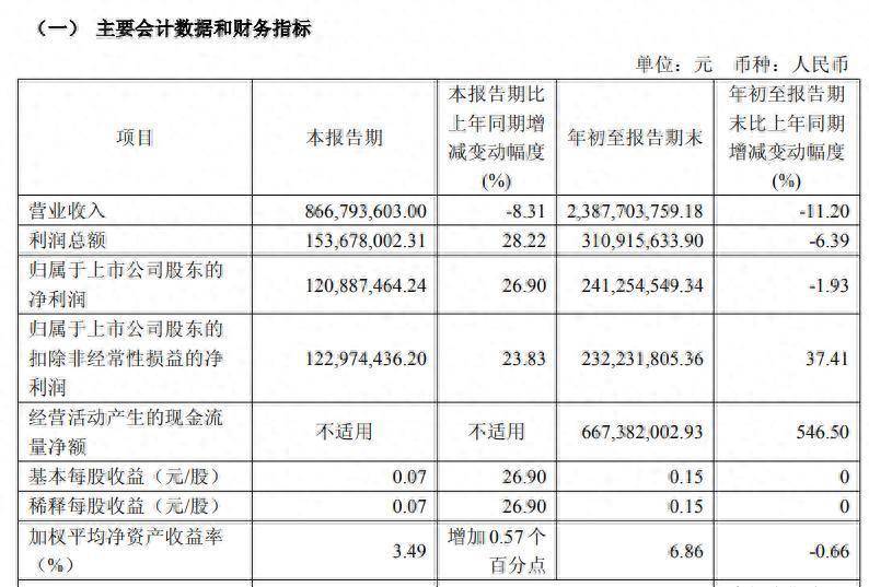 维维股份三季报主要会计数据其中第三季度,公司营业收入为8.67亿元,同比下降8.31%;归母净利润为1.21亿元,同比上升26.90%;扣非归母净利润为1.23亿元,同比上升23.83%。