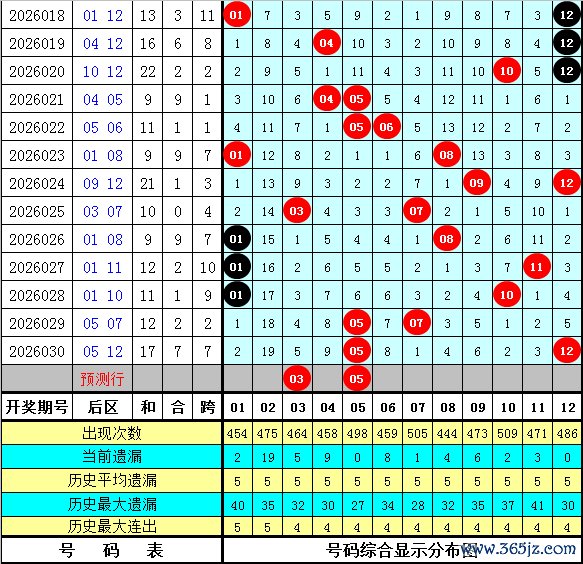 石浩第2026031期大乐透后区分析:后区上周星期三后区奖号为01和10,上期开出奖号05和12,最近9周星期三与最近9期后区奖号大小比分别为7:11和9:9,奇偶比分别为9:9和12:6,本期预计后区开出全小组合。注意号码02、03、05、06。