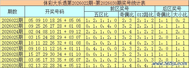 体彩大乐透第2026030期奖号为02 13 22 28 34 + 05 12,前区号码五区比为1:1:0:2:1,奇偶比为1:4,012路比为0:4:1,后区号码奇偶比为1:1,大小比为1:1。